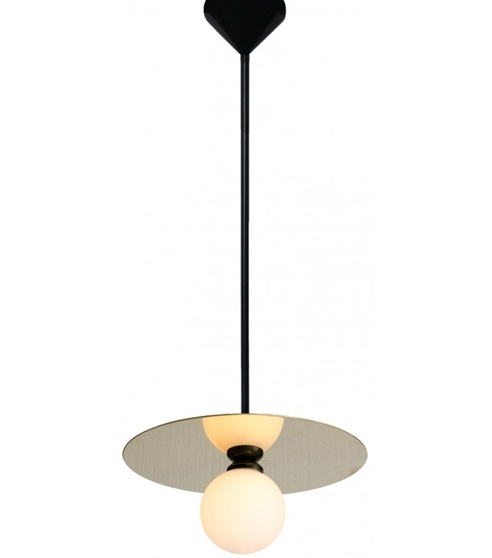 Disc and Sphere Horizontal es una lámpara colgante producida por Atelier Areti, hecha de metal, con esferas de vidrio.Disco de acero recubierto de polvo en latón pulido, y estructura metálica disponible en blanco o negro.